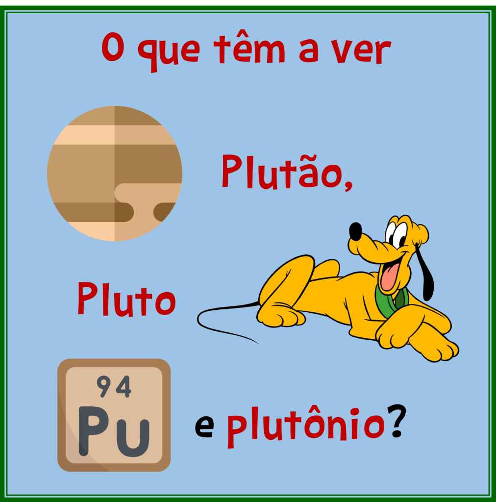 Os químicos também surfaram na onda do novíssimo Plutão. Olha só. O elemento de número atômico 92, o urânio, foi descoberto em 1789; seu nome homenageou o planeta Urano, encontrado 8 anos antes. O elemento 93 foi descoberto em 1940 e nomeado em referência ao planeta seguinte: netúnio. Em 1941, acharam o elemento 94, que, pela sequência lógica, acabou tendo o nome do planeta posterior: plutônio.