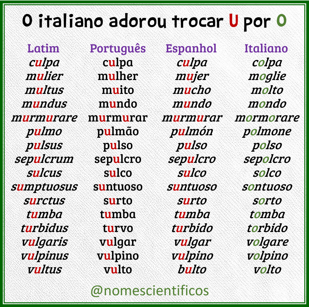 Depois da postagem dsobre mal-assombrado, dezenas de leitores me perguntaram o motivo de algumas palavras italianas serem com O, quando a original latina e a equivalente portuguesa são com U. (Mentira… só um que me perguntou isso, rsrs.)
